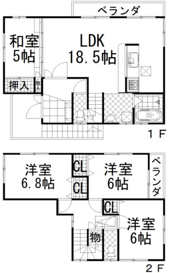 | 間取内容 | LDK18.5帖 1階 1室和室5帖 1階 1室洋室6.8帖 2階 1室洋室6帖 2階 2室 | ||