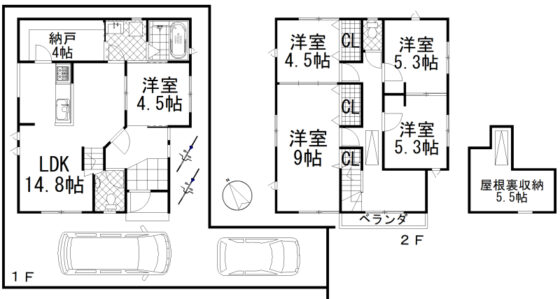| 間取内容 | LDK14.8帖 1階 1室S4帖 1階 1室洋室4.5帖 1階 1室洋室5.3帖 2階 2室洋室4.5帖 2階 1室洋室9帖 2階 1室 屋根裏収納 |